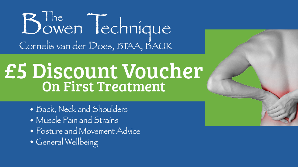 Cornelis van der Does is offering a £5 discount voucher on your first Bowen Technique treatment. Whether you want help with general aches and pains, or want to work on a specific problem, Cornelis can help you. You do not have to be unwell to benefit from a Bowen treatment- many clients in good health […]